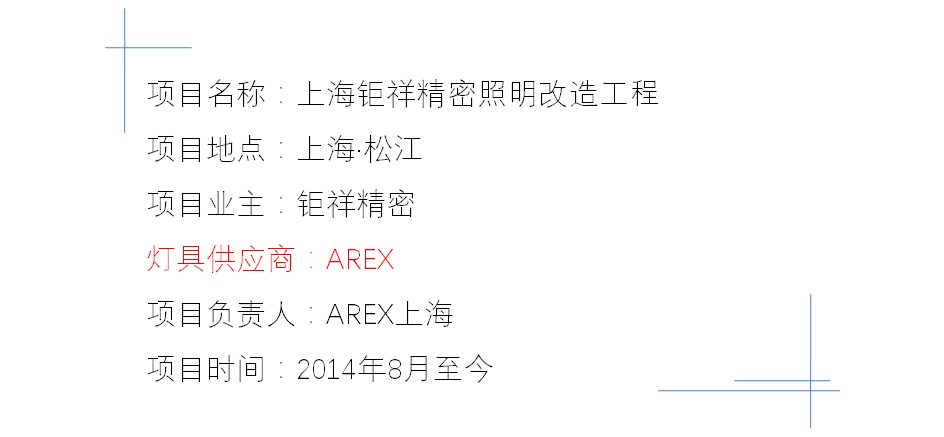 上海钜祥精密成立於1995年12月,生產各類精沖模、精密型腔模具標準件,並銷售自產產品。2014年,AREX廣中照明燈具通過長達半年的嚴格樣燈測試後,這座以精密連續沖模聞名世界的實業公司,歷久彌新,開始廠區照明環境的全面改善。