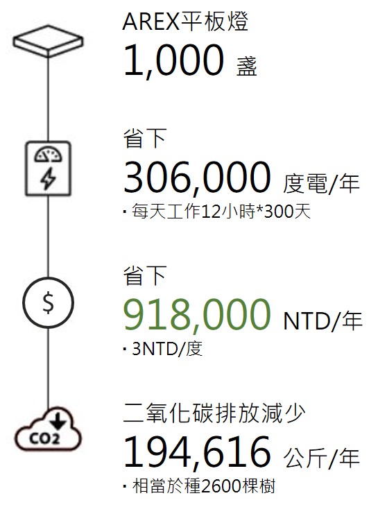 首先,照明燈具的能效非常重要,一般來說,燈具的能效越高,相同時間內耗電量則越低。目前,AREX整燈能效高達170lm/W,已面市的常規品能效也在140lm/W以上,較傳統螢光格柵燈盤節能超過75%。