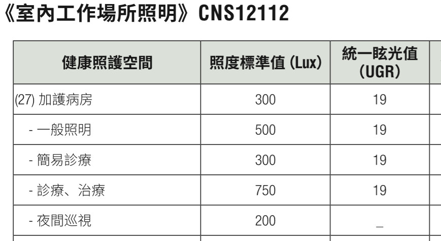 鑒於 ICU 具有護理和診療的雙重特性,其對照明環境的要求略為複雜。AREX 依照臺灣《室內工作場所照明》CNS12112,在嚴格滿足其對 ICU 規定的照度、統一眩光值及演色性標準值的情況下,通過科學的照度模擬,設計了最優化的布燈方式。