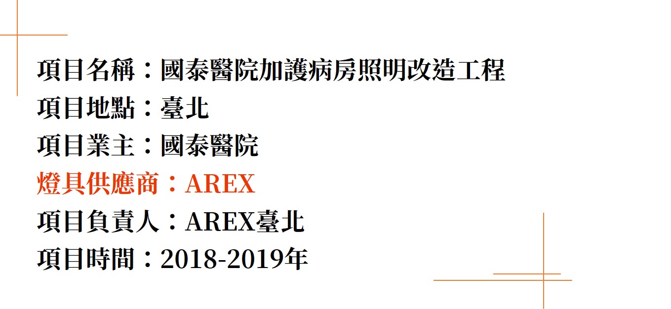 作為公共建築照明解決方案提供商,AREX 非常榮幸參與加護病房照明工程建設,與國泰醫院共同打造臺灣醫學中心。