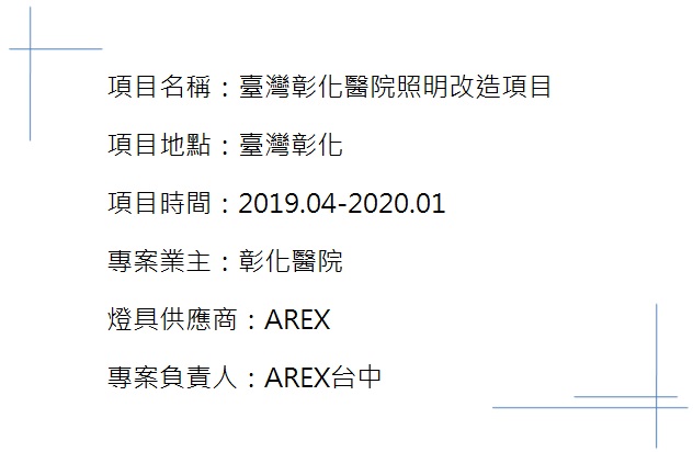 2020年1月,醫院照明改造項目順利完成。這所以「社區的好醫院,厝邊的好醫生」為立院宗旨的地方醫院煥然一新,繼續為彰化縣人民提供便捷、貼心有效的專業服務。而作為硬體裝備的提供商,AREX為此深感榮幸,同時感謝院方的信任和支持。